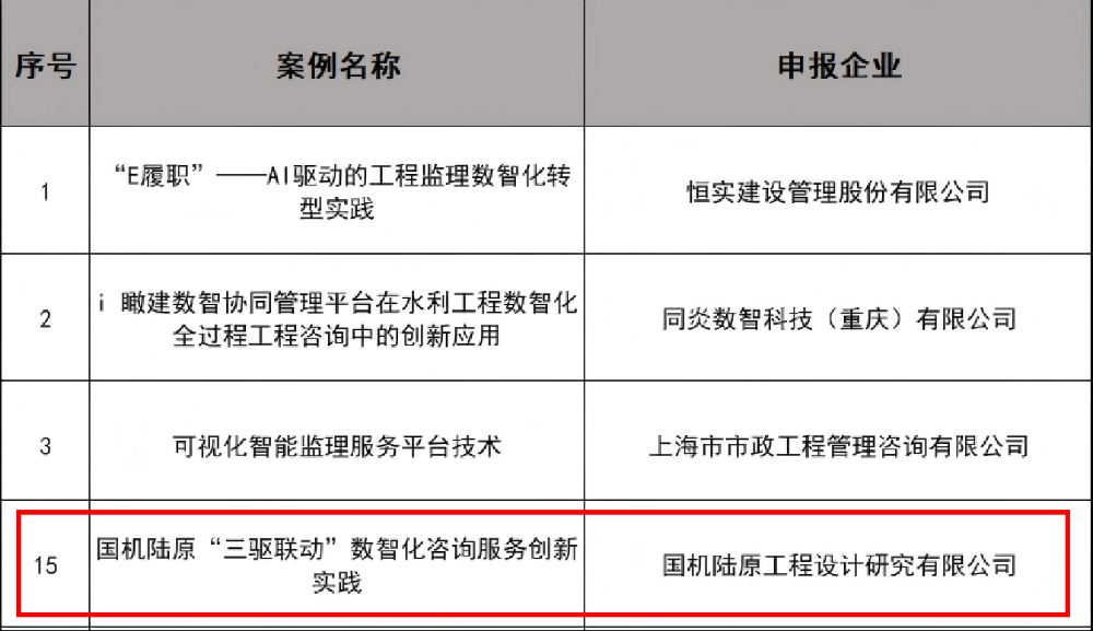 10月17日,公司申報的《國機陸原“三驅聯(lián)動”數(shù)智化咨詢服務創(chuàng)新實踐》案例,在《建設監(jiān)理》雜志第二屆“工程監(jiān)理咨詢企業(yè)創(chuàng)新實踐卓越案例”征集中,從全國眾多優(yōu)秀實踐中脫穎而出,成為30份入選的優(yōu)秀案例之一,標志著公司在工程咨詢數(shù)智化轉型領域的先行探索與領先實力獲得了行業(yè)高度認可。
